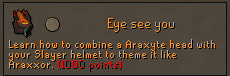 - Functionality added in to allow creation of the Araxyte Slayer Helmet! A massively popular request since the release of Araxxor, you can now speak to any slayer master, open the rewards interface, and purchase “Eye See You” which will give you the ability to create this cosmetic variant of the Slayer Helmet.